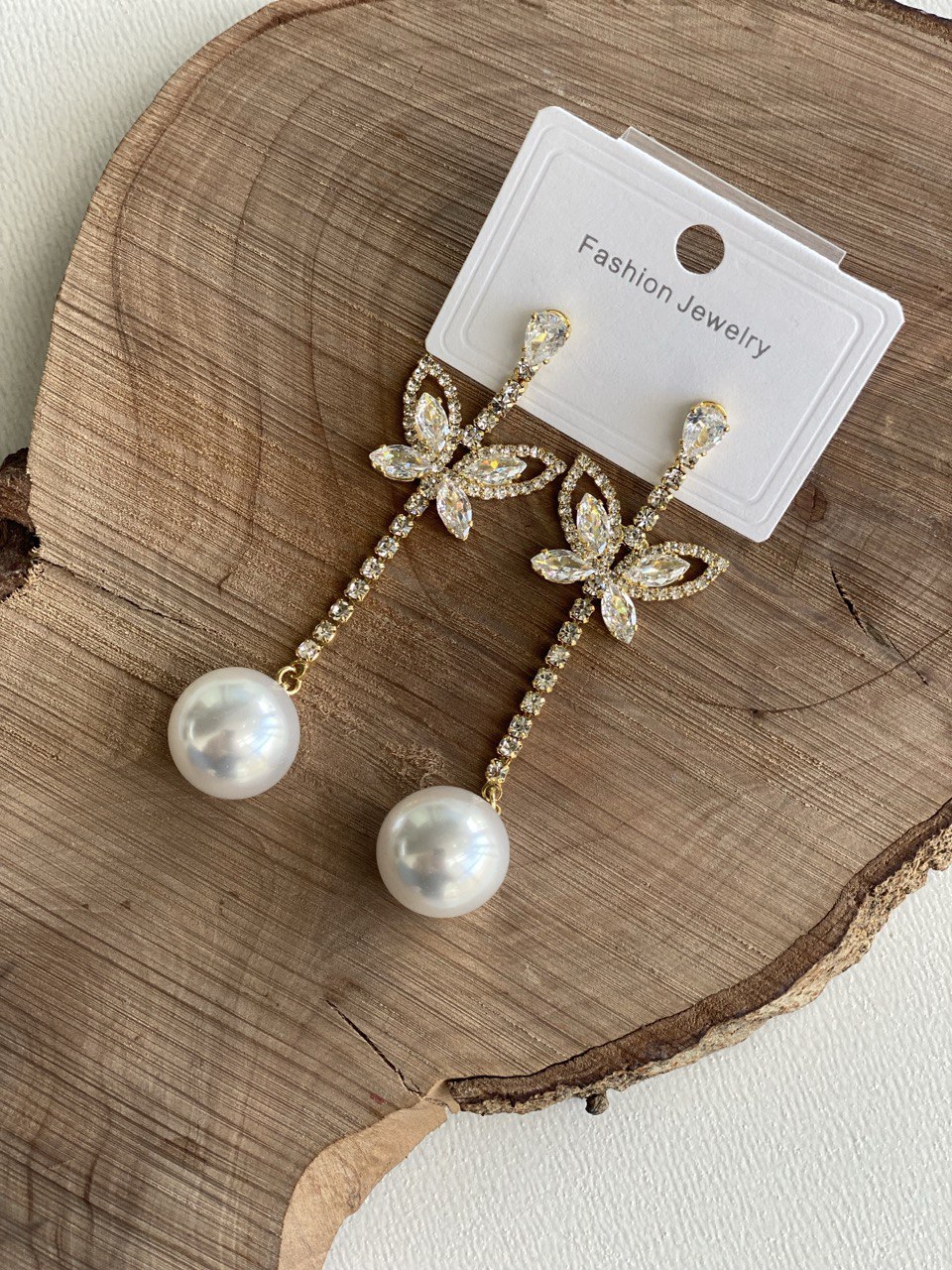 گوشواره جواهری آویز پروانه و مرواریدی طلایی
