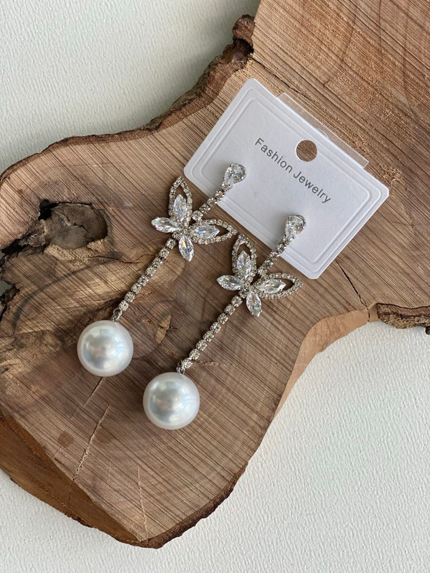 گوشواره جواهری آویز پروانه و مروارید نقره ای